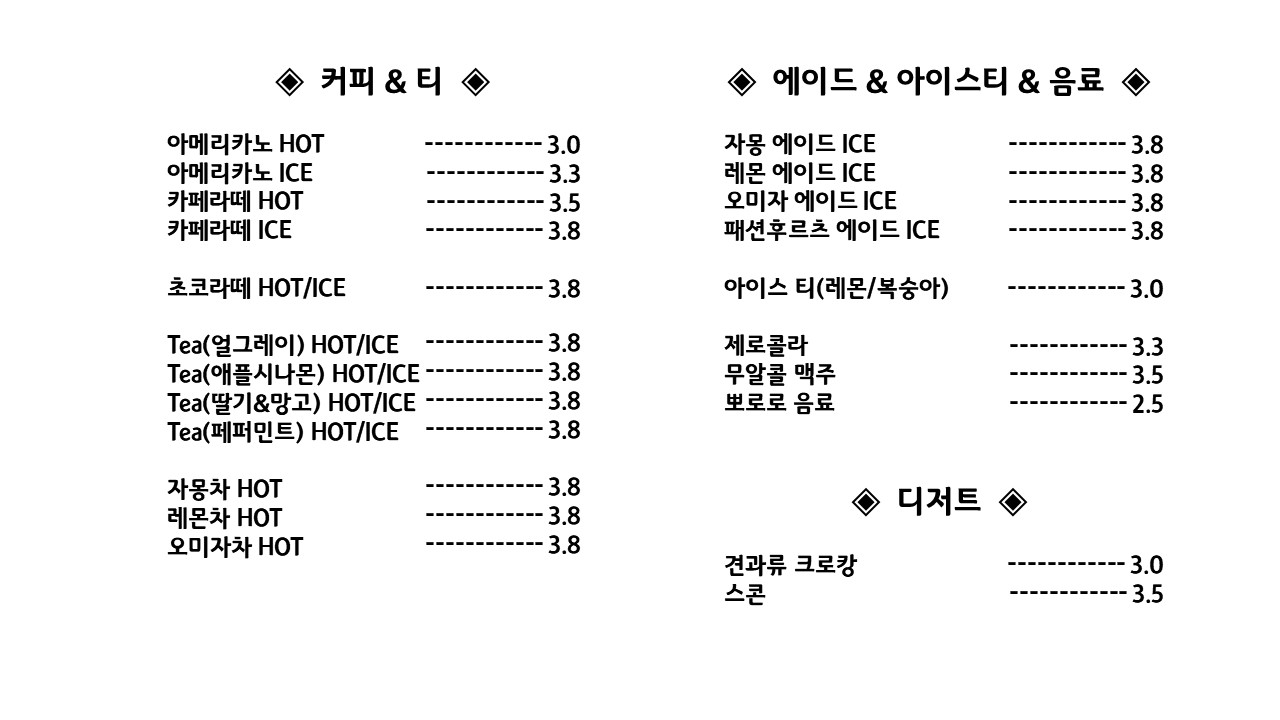 (NEW)닭가슴살샌드위치 8,000 | 햄치즈야채 샌드위치 7,500 | 찹찹 샌드위치 7,000 | 에그마요 샌드위치 6,000 | 카야토스트 5,500 | 아메리카노 3,800 | 카페라떼 4,500 | 바닐라라떼 5,000 | 연유라떼 5,000 | 헤이즐넛라떼 5,000 | 카라멜마끼야또 5,000 | 복숭아아이스티 3,800 | (수제)딸기라떼_OnlyIce 5,500 | 초코라떼 5,500 | 로얄밀크티 5,800 | 레몬차 5,000 | 자몽차 5,000 | 유자차 5,000 | 레몬자몽티 5,000 | (수제)매실차 5,000 | (겨울한정)뱅쇼_Onlyhot 5,000 | 홍차&허브차 3,800 | 레샷추 5,500 | 레몬에이드 5,300 | 자몽에이드 5,300 | 매실에이드 5,300 | 단호박가나슈 쿠키 4,300 | 아메리칸 청크 쿠키 2,800 | 버터쿠키4P 3,300 | 초코버터쿠키4P 3,800 | 레몬 파운드 케이크 4,800 | 얼그레이 파운드 케이크 4,800 | 황치즈 파운드 케이크 4,800 | 초코파운드 케이크 4,800 | 플레인요거트스무디 6,000 | 딸기요거트스무디 6,000 | 딸기스무디 6,000 | 유자래스무디 6,000
