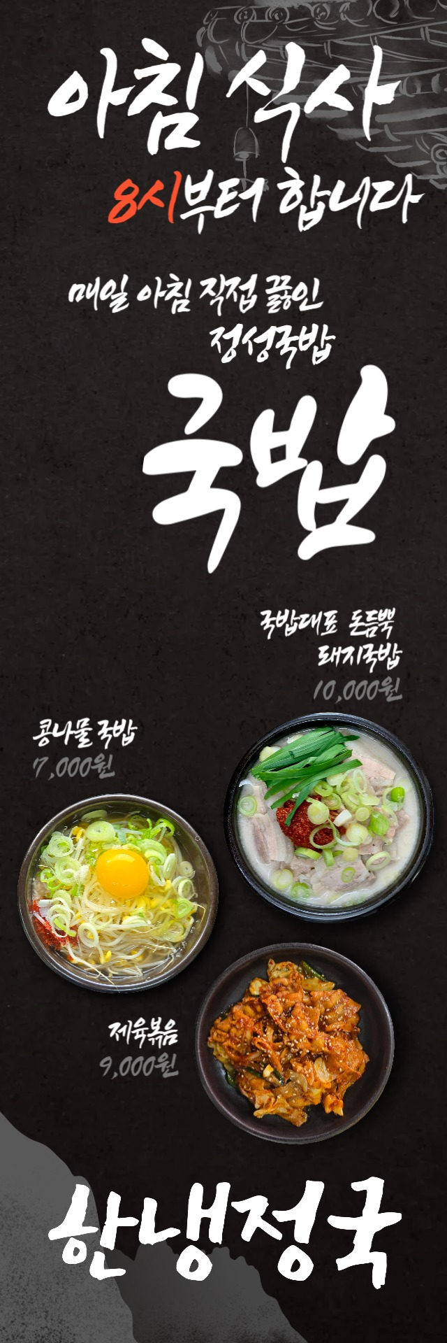 콩나물국밥 7,000 | 제육볶음 9,000 | 국밥대표 돈듬뿍 돼지국밥 10,000 | 미녀들의 돈사랑 살코기국밥 11,000 | 육즙품은 돈가득 삼겹수육국밥 12,000 | 주님과함께 돈트리오 국밥 12,000 | 불티나 돈폭탄 제육덮밥 11,000 | 입이가 돈수북 삼겹덮밥 11,000 | 한입에 불꽃, 한냉 비냉(계절메뉴) 10,000 | 입안이 겨울, 한냉 물냉(계절메뉴) 10,000 | 냉면사리추가(계절메뉴) 5,000 | 무항생제 한 돈 한 상차림(600g) 39,000 | 너랑먹고싶다 수육 25,000 | 내속을 풀어줄 AI 돼지수육전골 25,000 | 이슬에 제육볶음 25,000 | 테라 5,000 | 카스 5,000 | 참이슬 5,000 | 처음처럼 5,000