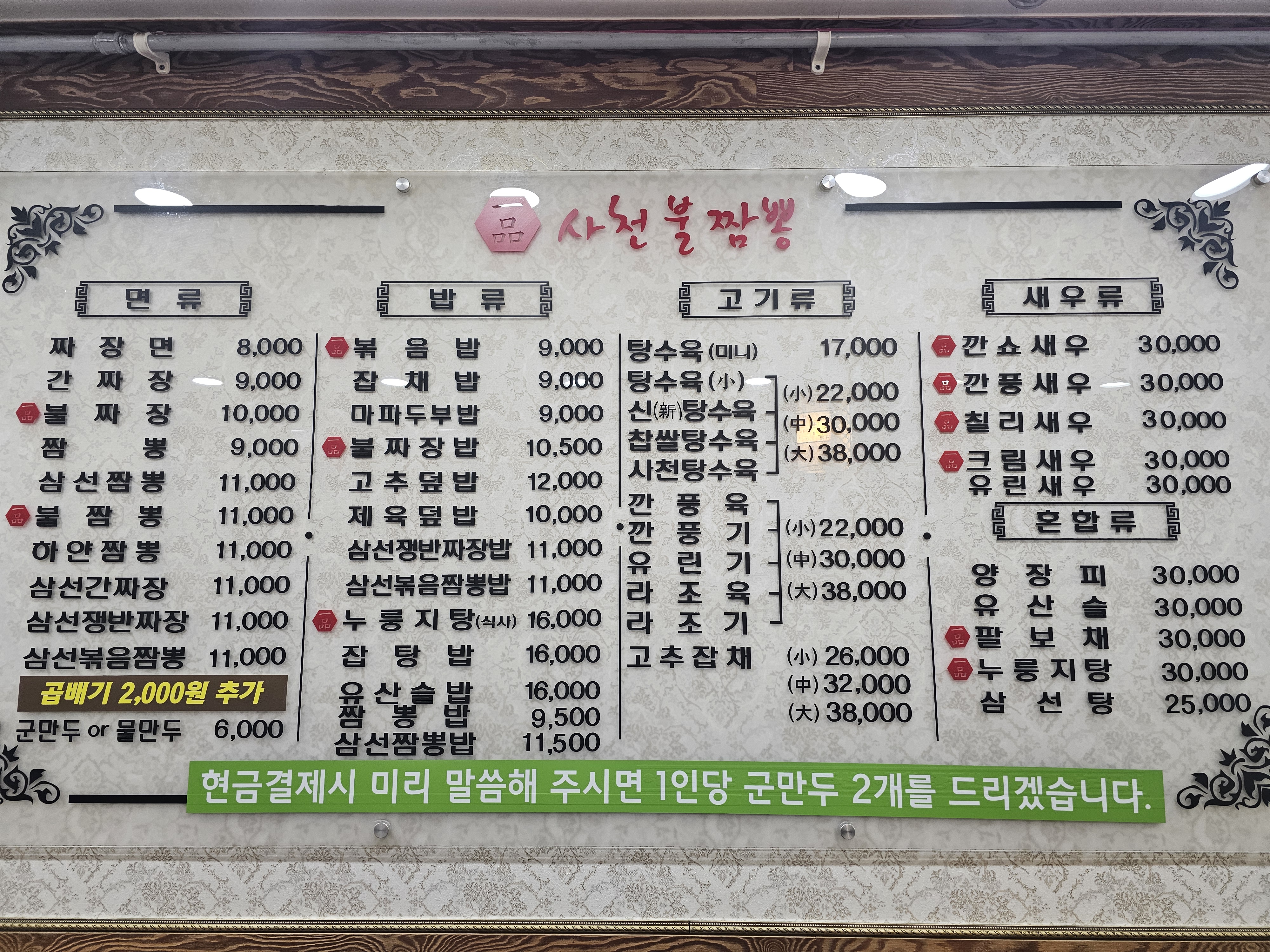 짜장면 8,000 | 짬뽕 10,000 | 삼선쟁반짜장 10,000 | 중국식 탕수육 (꿔바뤄) 24,000 | 사천 꿔바뤄 26,000 | 레몬 크림새우 30,000